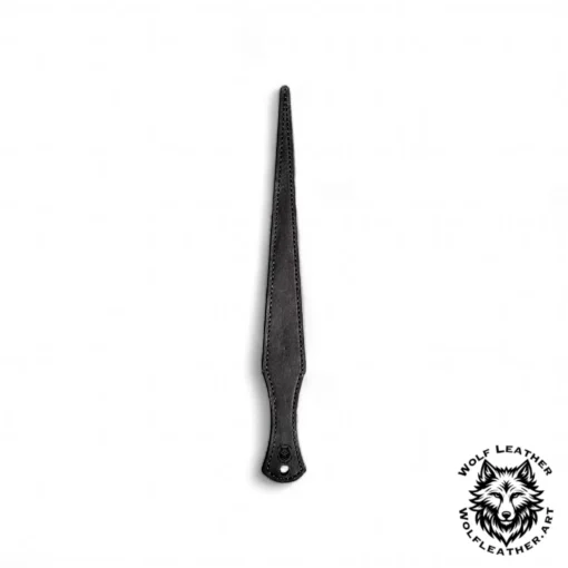 Dieser Prügel ist nichts für schwache Nerven. Zwei Schichten aus zähem, insgesamt etwa 8 mm dickem Leder, die über die gesamte Länge handgenäht sind, ergeben ein Werkzeug, das unauffällig aussieht, aber wie ein Raubtier wirkt. Seine Form verjüngt sich von etwa 4 cm am Griff auf nur 1 cm an der Spitze - und genau darin liegt sein zerstörerisches Potenzial.