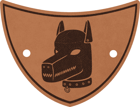 Štítový tvar Deluxe spony o velikosti 13 × 10 cm s tmavě hnědým okrajem nese laserově gravírovaný portrét psí hlavy v kožené masce s čenichem, vztyčenými ušima a obojkem s kroužkem u krku – vše vypálené do kůže s ostrými liniemi, bohatými detaily a hlubokým kontrastem světla a stínu. Motiv vzdává hold pupplay komunitě s plnou vážností a řemeslnou péčí. Tmavě hnědý okraj lze volitelně prošít strojově nebo ručně, upevnění obstarává francouzské zapínání nebo bambusová jehlice o délce 15 cm.