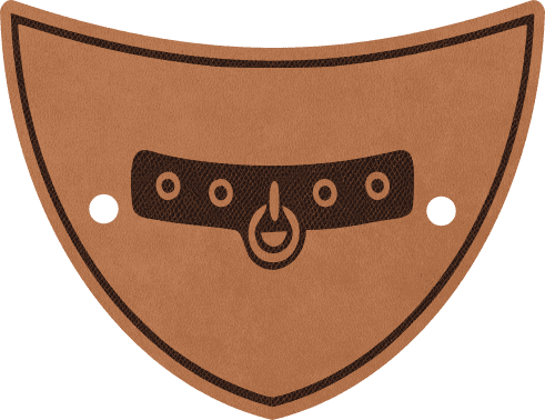 Štítový tvar Deluxe spony o velikosti 13 × 10 cm s tmavě hnědým okrajem nese laserově gravírovaný motiv klasického obojku s nýty a centrálním kroužkem – precizní linie vypálené do kůže s výrazným kontrastem, který vynikne na každém světle. Větší formát dává motivu více prostoru a váhy než oválná varianta. Tmavě hnědý okraj lze volitelně prošít strojově nebo ručně, upevnění obstarává francouzské zapínání nebo bambusová jehlice o délce 15 cm.