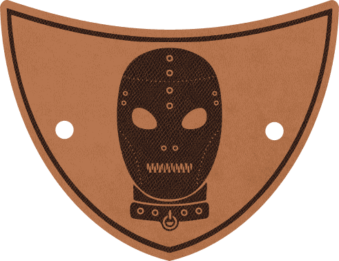 Štítový tvar Deluxe spony o velikosti 13 × 10 cm s tmavě hnědým okrajem nese laserově gravírovaný motiv celoobličejové deprivační masky s průzory pro oči, ozdobnými nýty lemujícími celou masku, se zipem přes ústa a obojkem s nýty a kroužkem u krku. Bohatší detailing oproti první variantě dodává motivu výraznější silový náboj. Tmavě hnědý okraj lze volitelně prošít strojově nebo ručně, upevnění obstarává francouzské zapínání nebo bambusová jehlice o délce 15 cm.