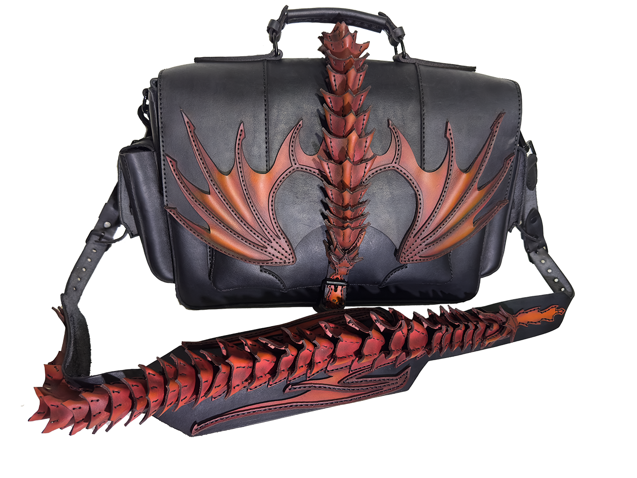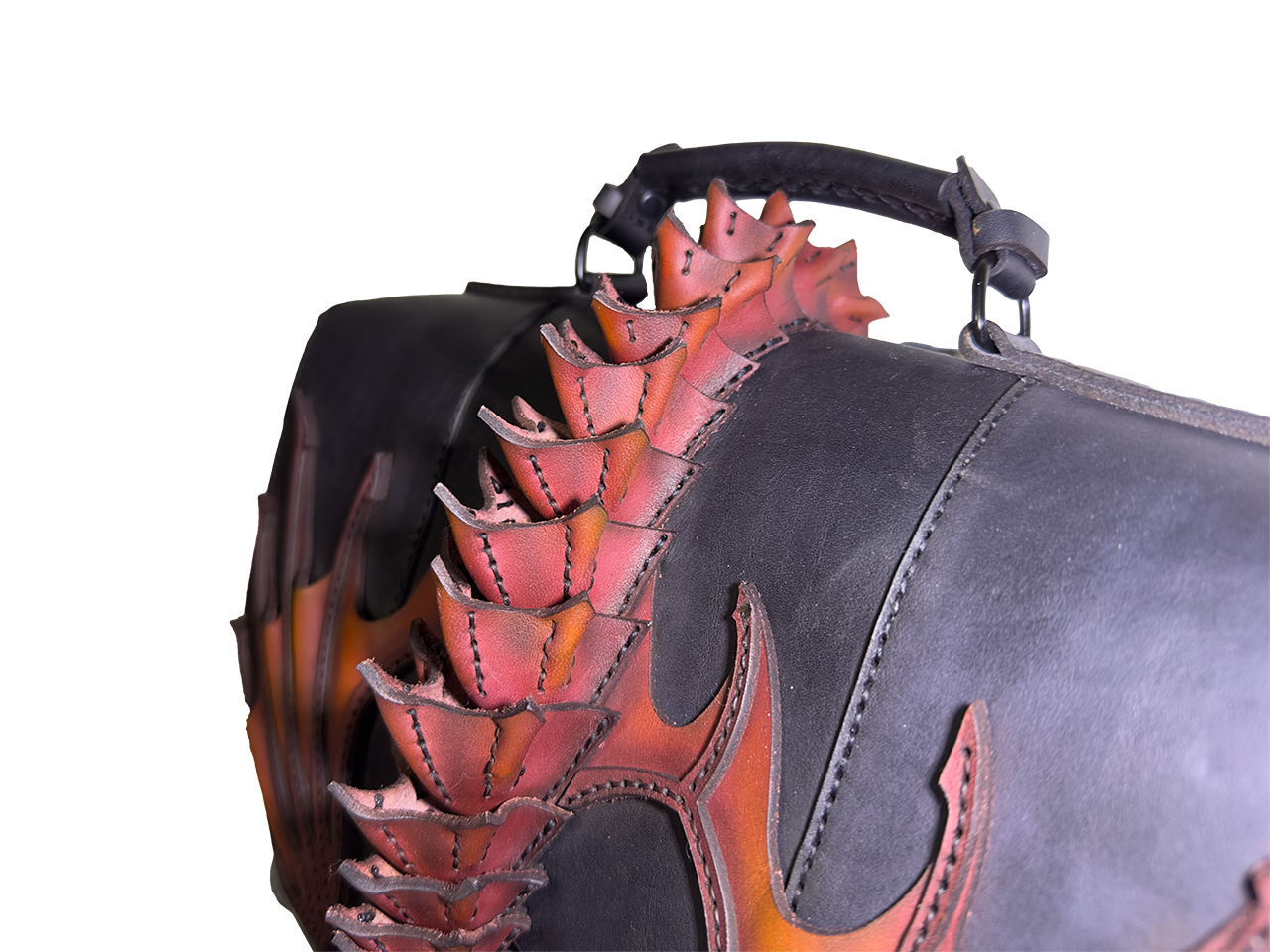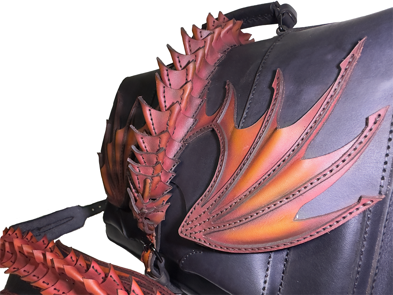 Taška o rozměrech 42 × 25 × 10 cm je vyřezávaná a modelovaná do podoby draka s propracovanými křídly, šupinami a ocasem. Každá šupinka je ručně šitá a tvarovaná, křídla mají 3D reliéf pro dramatický efekt. Airbrush barvení vytváří přechody od matné černé přes oranžovou k žhavé červené, což dodává tašce magický, ohnivý vzhled – každý kus je absolutní originál díky individuálnímu zpracování.
