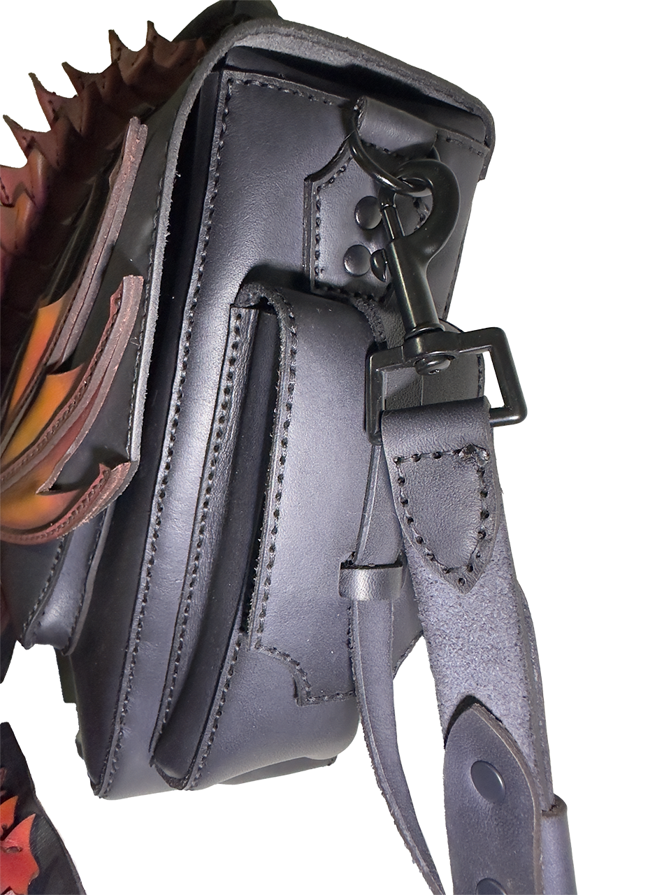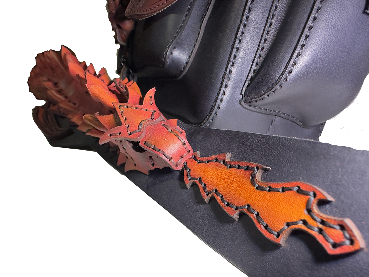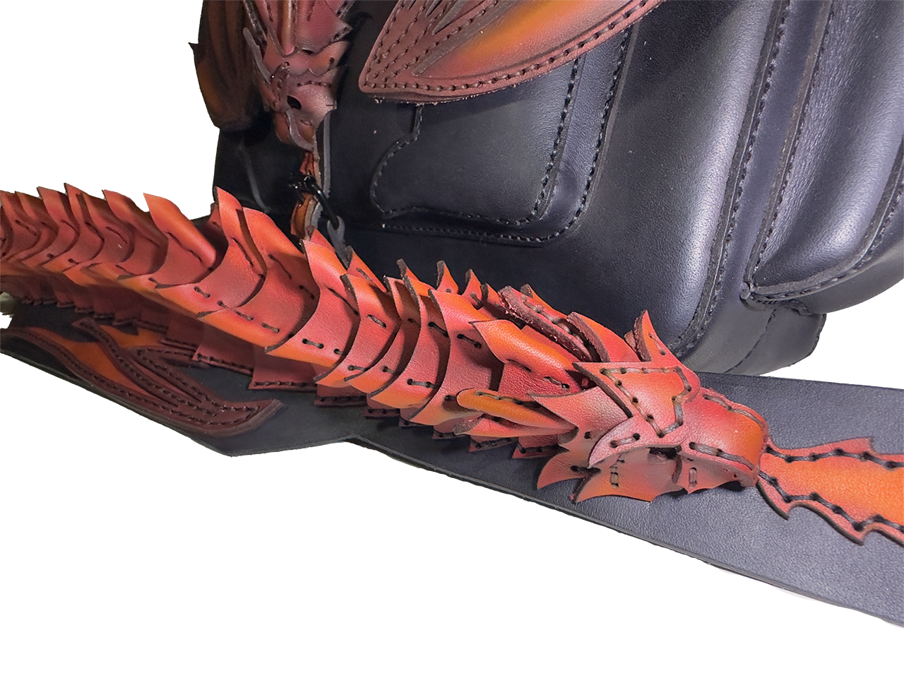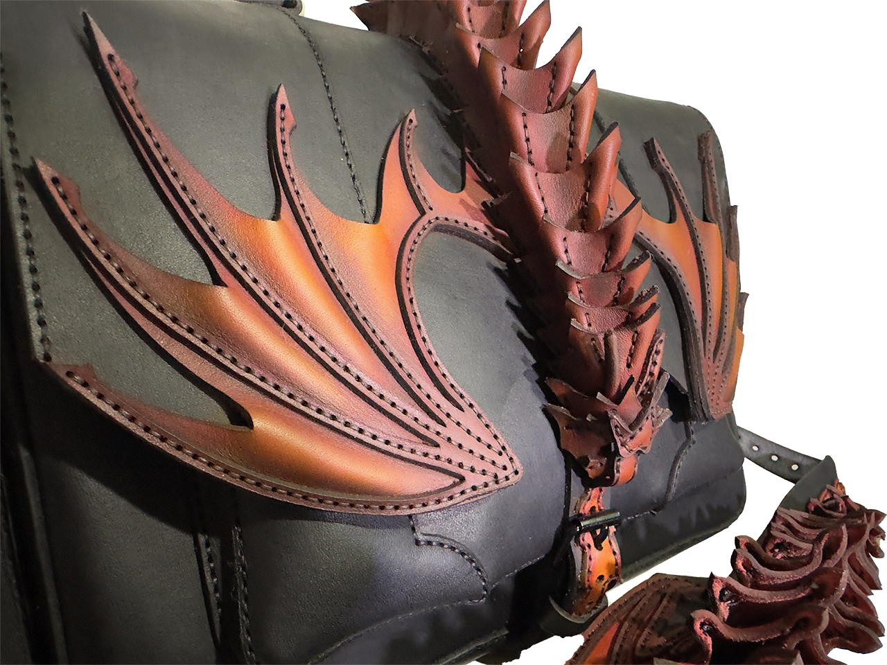 Taška o rozměrech 42 × 25 × 10 cm je vyřezávaná a modelovaná do podoby draka s propracovanými křídly, šupinami a ocasem. Každá šupinka je ručně šitá a tvarovaná, křídla mají 3D reliéf pro dramatický efekt. Airbrush barvení vytváří přechody od matné černé přes oranžovou k žhavé červené, což dodává tašce magický, ohnivý vzhled – každý kus je absolutní originál díky individuálnímu zpracování.