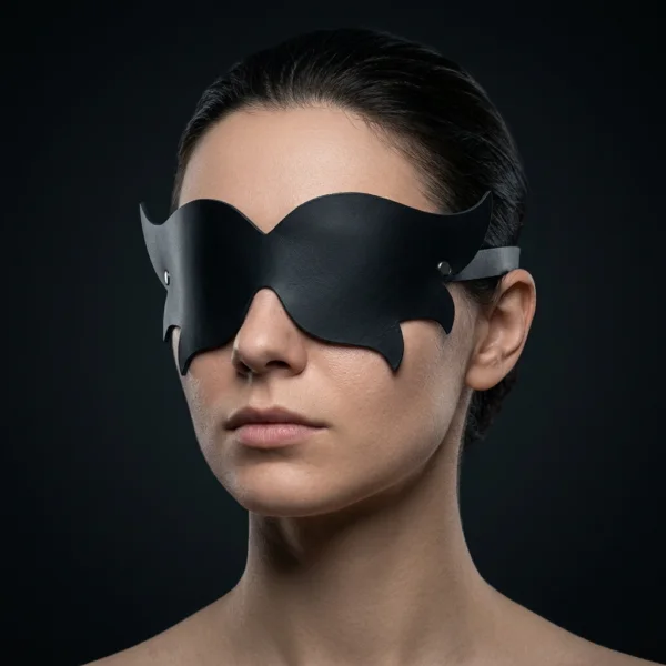 Maska stojí na plném zakrytí očí, ale její tvar je dynamičtější než u čistě hladkých modelů. Horní okraj se zvedá do měkkých špiček, zatímco spodní část je po stranách jemně vykrojená, což celku dodává lehký, stylizovaný vzhled. Telecí kůže o tloušťce 1,5–2 mm zajišťuje pohodlí, poddajnost a příjemné nošení, uchycení kolem hlavy na gumu pak drží masku spolehlivě na místě.