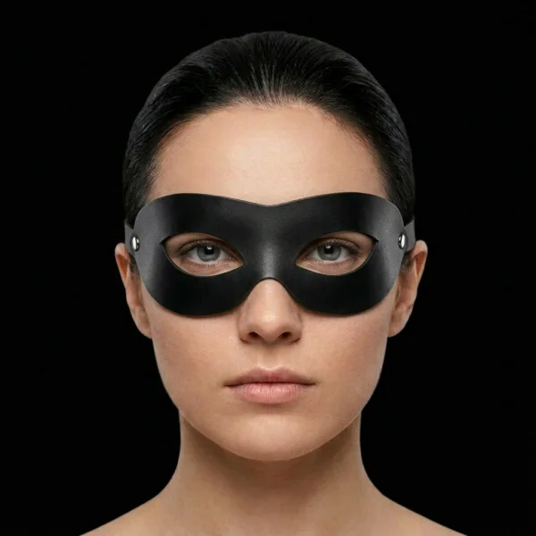 Kožená škraboška 7 – varianta s měkčí horní linií a lehce hranatějšími okraji. Poskytuje velkorysé zakrytí očního okolí s naprosto volným průzorem, čímž vytváří výrazný a vyvážený vzhled.