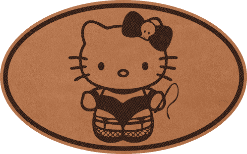 Oválný tvar spony o rozměru 100 × 70 mm s tmavě hnědým okrajem nese laserově gravírovaný motiv Dom Kitty – kočičky v body a síťovaných punčocháčích s bičíkem v tlapce a lebkou na mašli, vypálené do kůže s jemnými, detailními liniemi. Protipól k Sub Kitty – stejná ikonická postava, úplně jiný příběh. Upevnění obstarává bambusová jehlice nebo francouzské zapínání, ručně vyrobená z 3 mm hovězí kůže.
