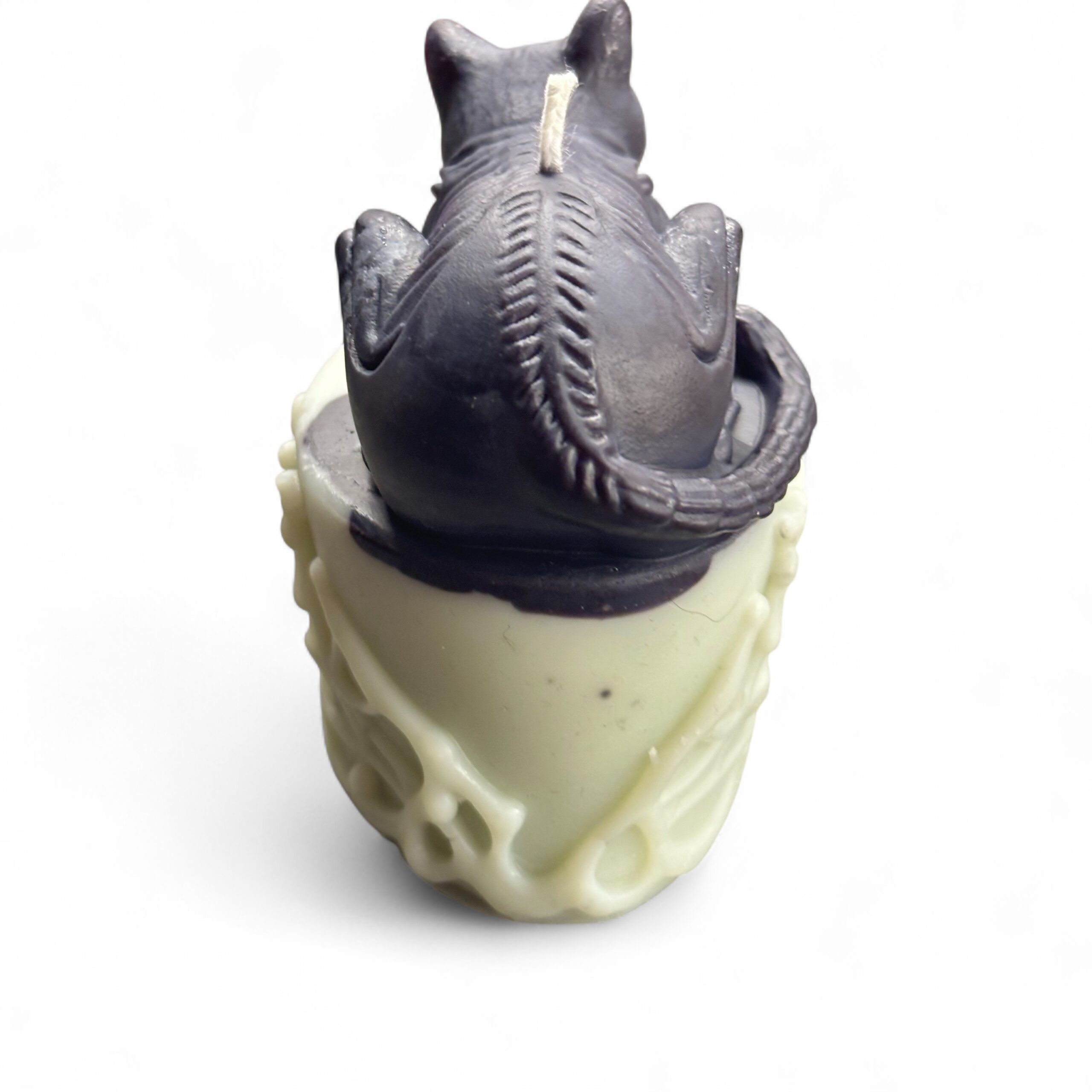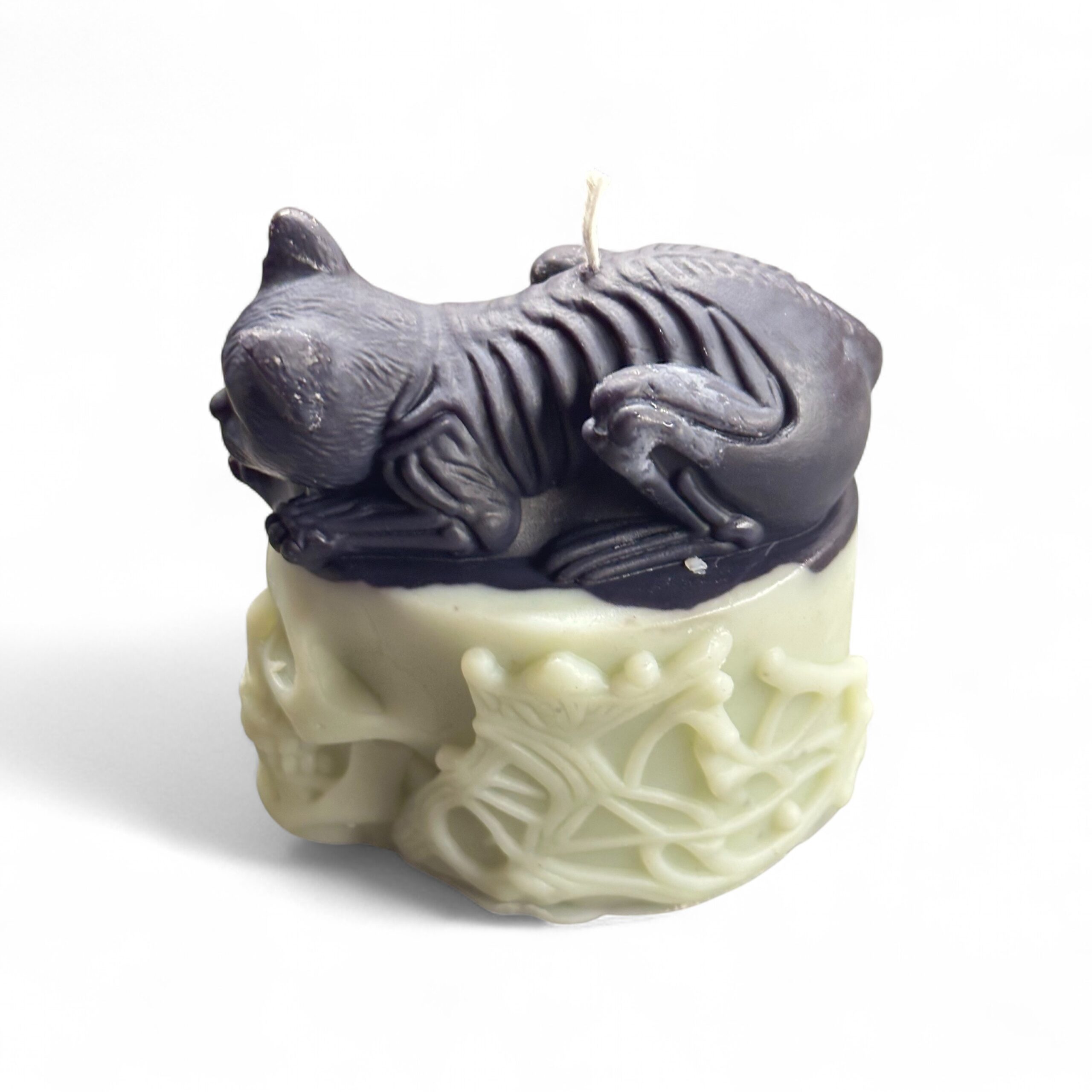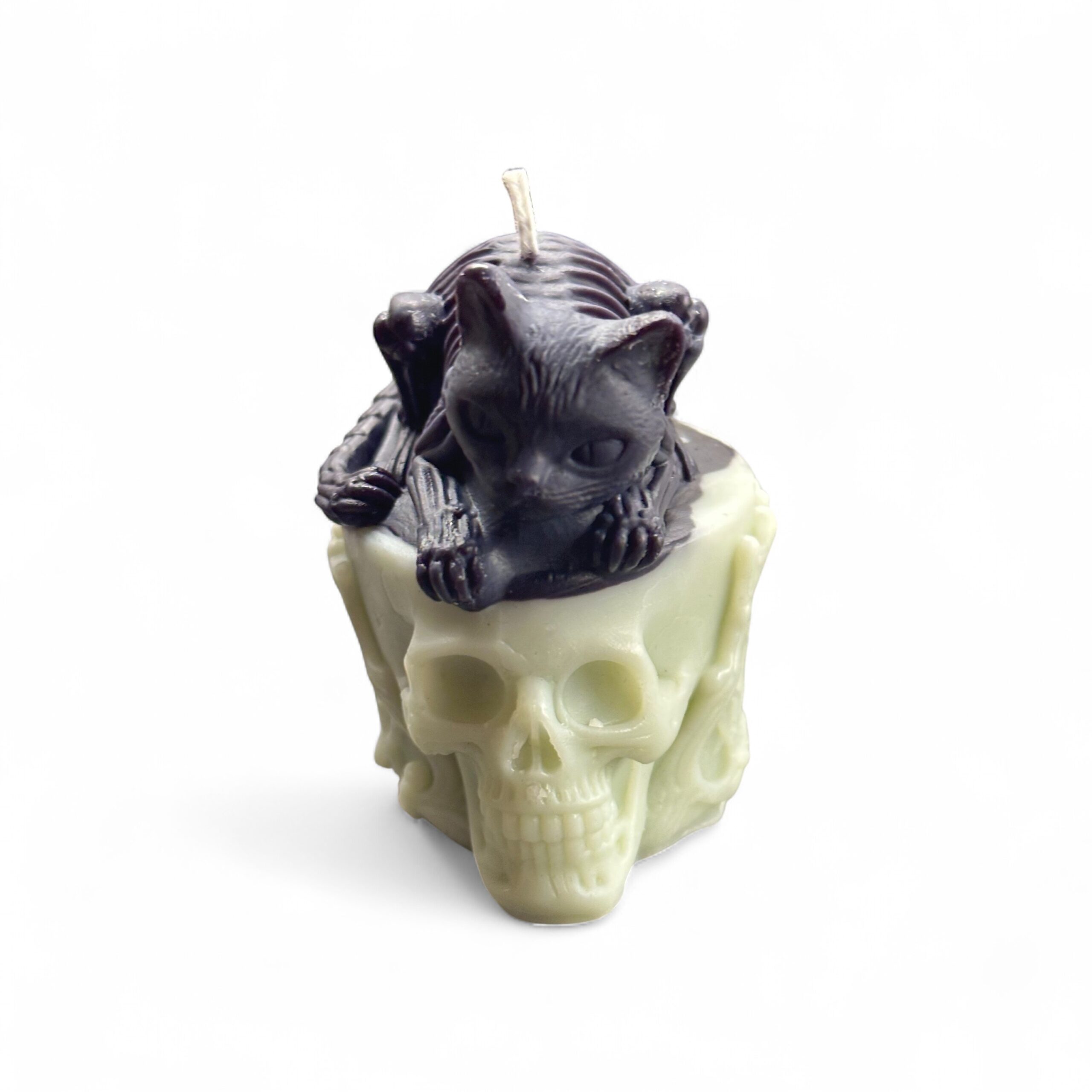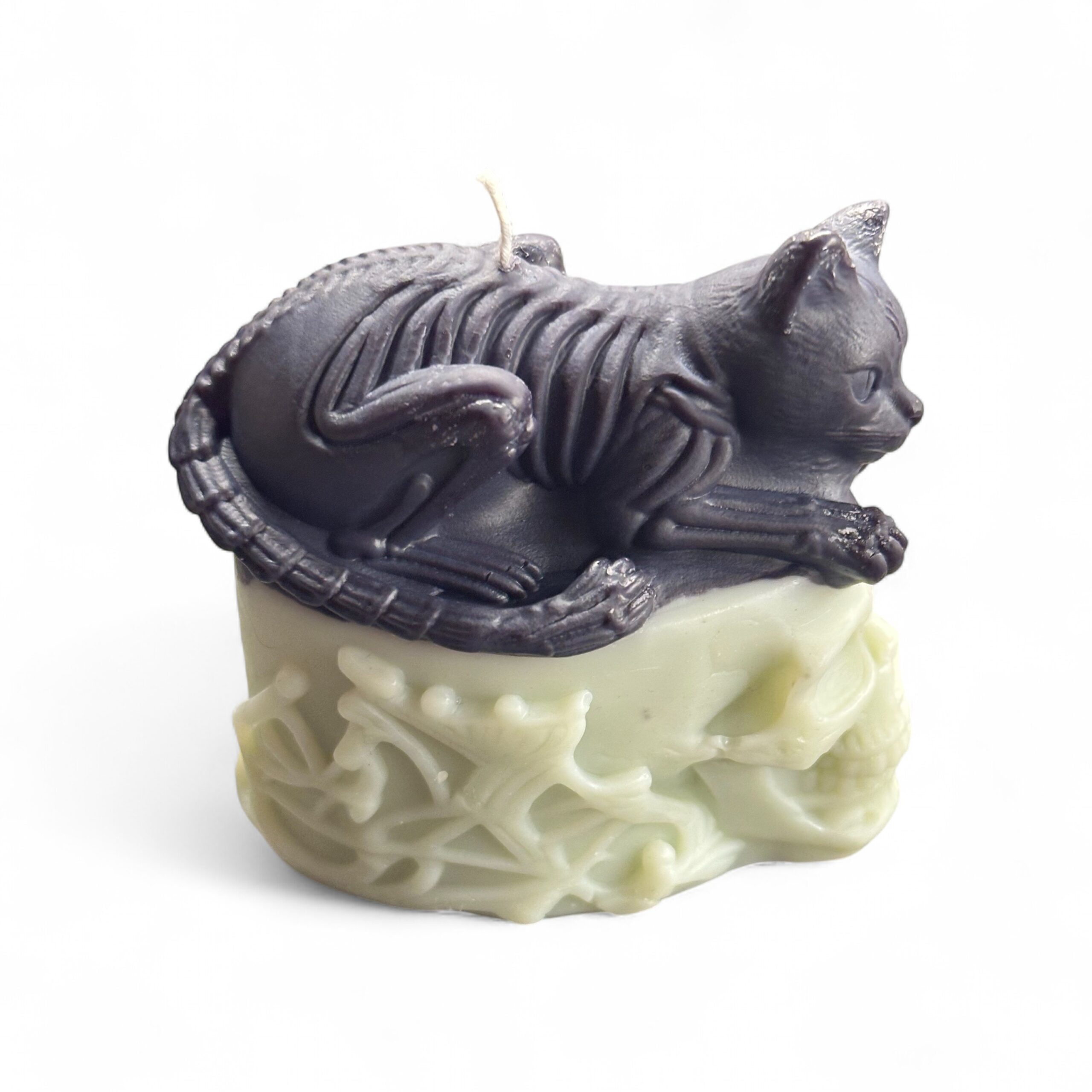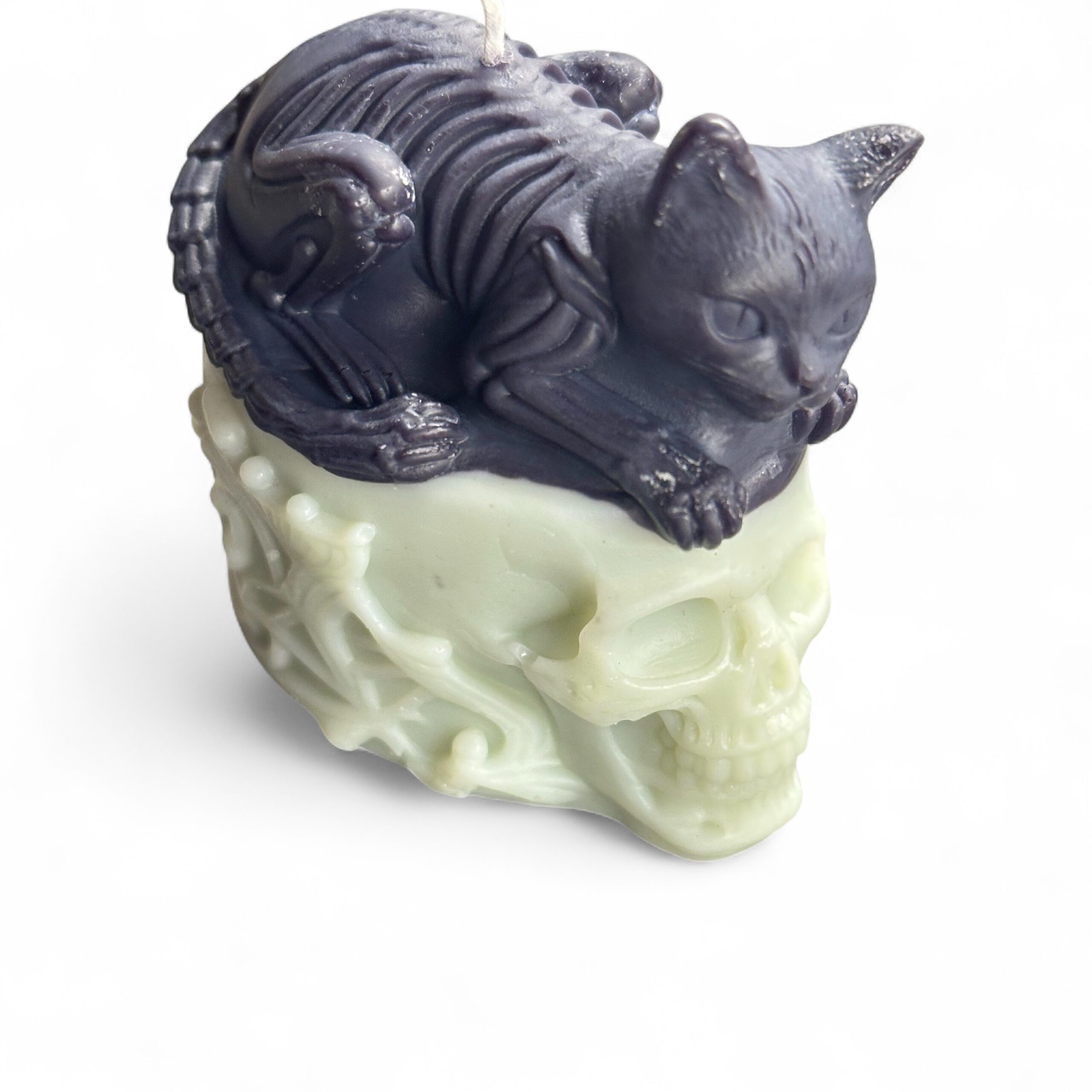 Svíčka Kočka na lebce – temnota a elegance v jednom precizně odlitém kousku. Klidný okamžik věčnosti, kde se svět živých dotýká stínu – černá kočka na bílé lebce, jejíž výraz se v plameni mění a odhaluje nové tvary světla i stínu.